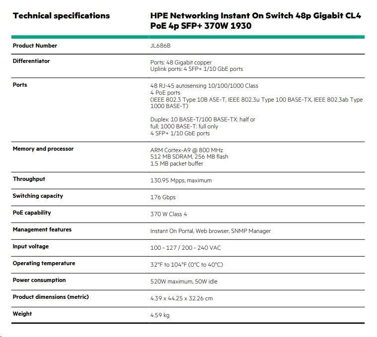 | Aruba Instant On 1930 48G Class4 PoE 4SFP/SFP+ 370W Switch (JL686B) | ||