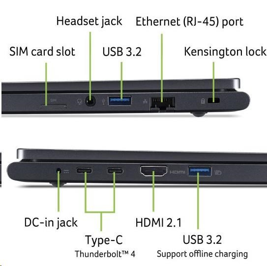 2x USB Type-C port USB 3.2 Gen2 (až 10 Gbps) / Display port over USB-C / Thunderbolt 4 / USB nabíjanie 5 V; 3 A / DC-in port 20 V; 65 W s podporou USB Type-C dokovania
