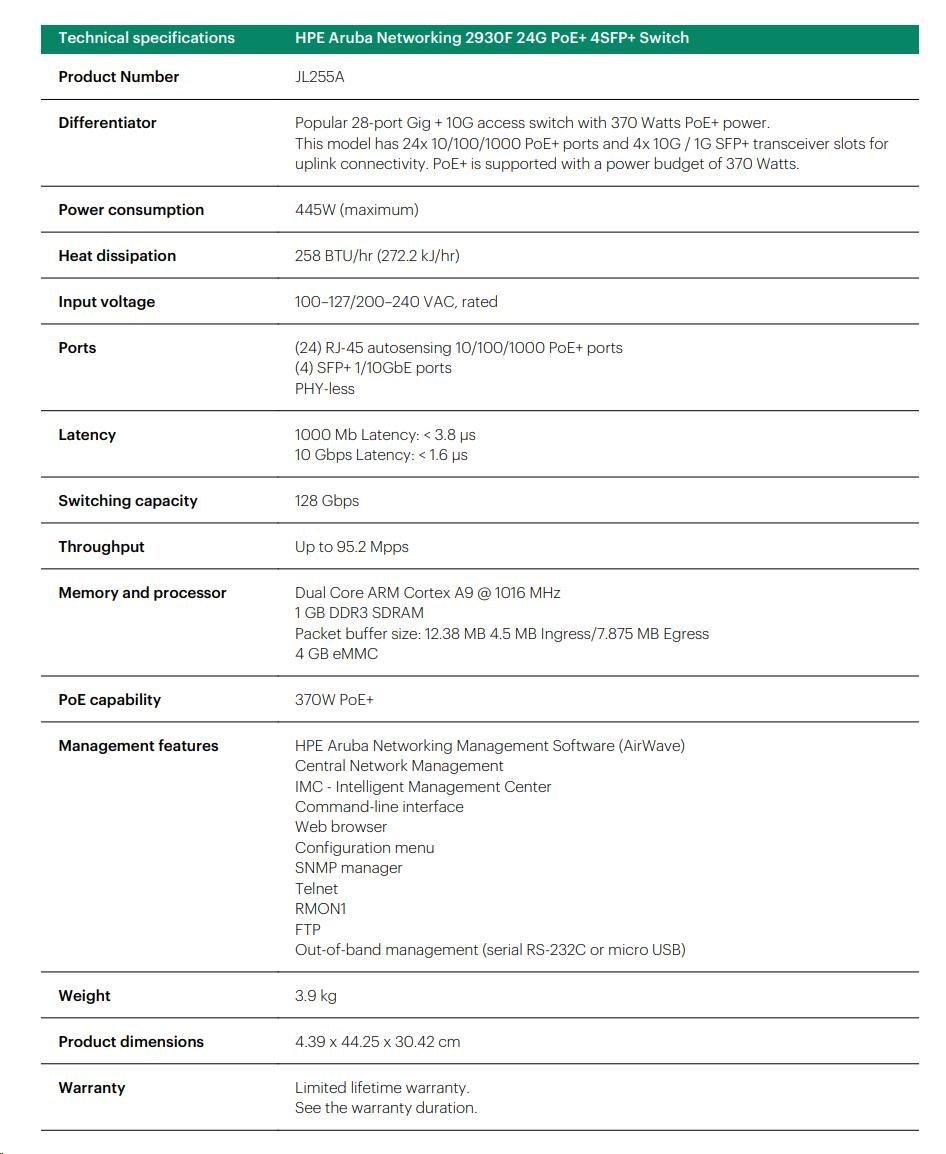 | Management features | HPE Aruba Networking Management Software (AirWave) Central Network Management IMC - Intelligent Management Center Command-line interface Web browser Configuration menu SNMP manager Telnet RMON1 FTP Out-of-band management (serial RS-232C or micro USB) |