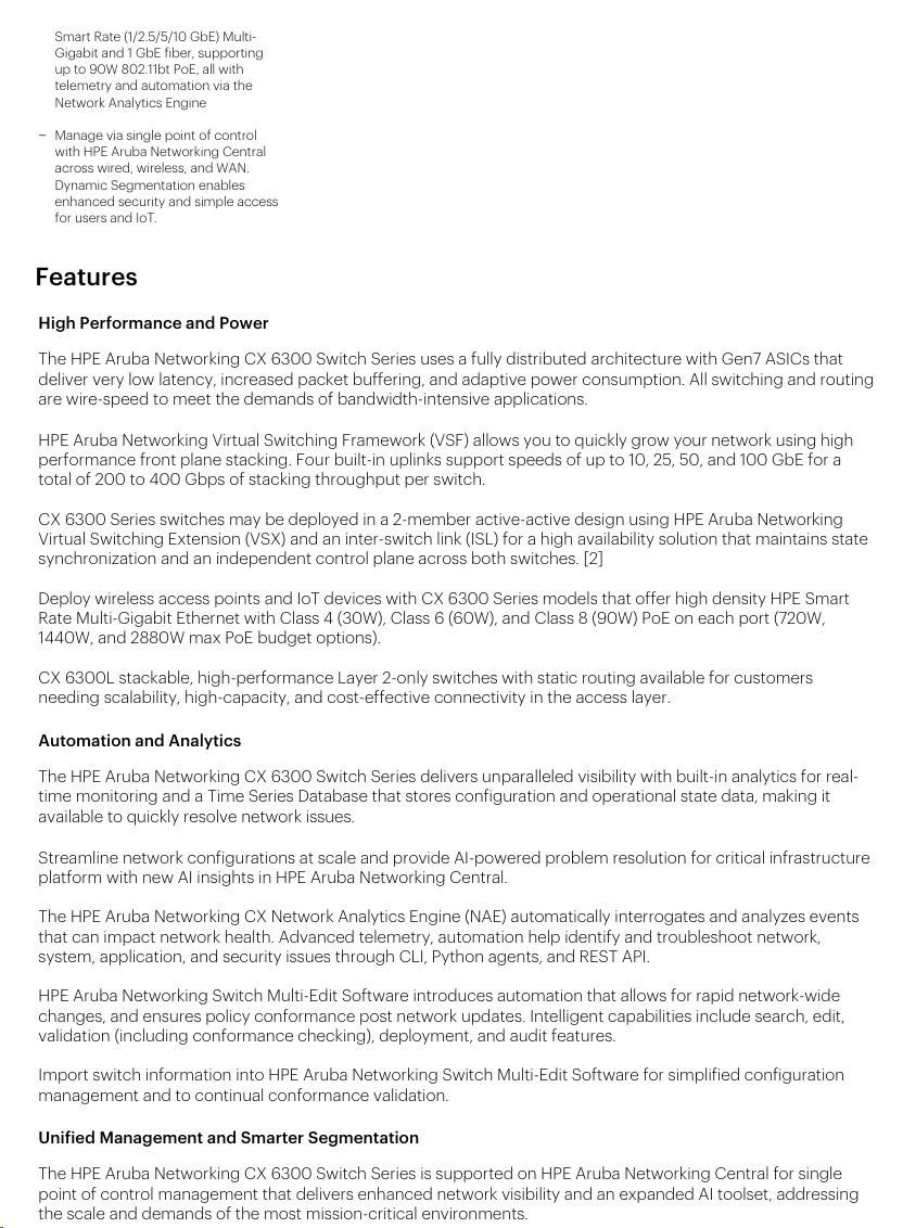 | Aruba 6300F 48-port 1GbE Class 4 PoE and 4-port SFP56 Switch (JL665A) | ||