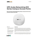 | Summary Aruba 610 Series Access Points are designed to take advantage of the 6 GHz band using two radios that can deliver comprehensive tri-band coverage in a multi-AP environment and better meet the growing demands of Wi-Fi due to increased use of video, growth in client and IoT devices, and expanded use of cloud. With a 3.6 Gbps combined peak data rate for higher throughput and faster speeds for indoor use, the Aruba 610 Series delivers a cost-effective enterprise Wi-Fi 6E solution with increased capacity, wider channels, reduced power consumption. |