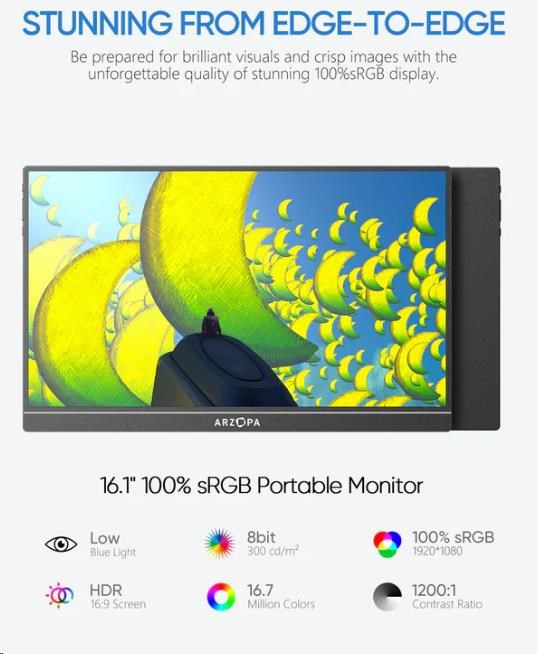 Akčné ponuky na váš e-mailPřenosný monitor Arzopa Z1C 16,1'' je vhodnou volbou pro lidi, kteří potřebují další obrazovku - doma, na služebních cestách nebo při studiu na dálku. Díky kompaktním rozměrům a tenkému provedení se snadno vejde do brašny na notebook a jeho lehká konstrukce (780 g) nezatíží vaše zavazadla. Je dobrou volbou, pokud chcete rozšířit svůj pracovní prostor, aniž by zabíral mnoho místa.