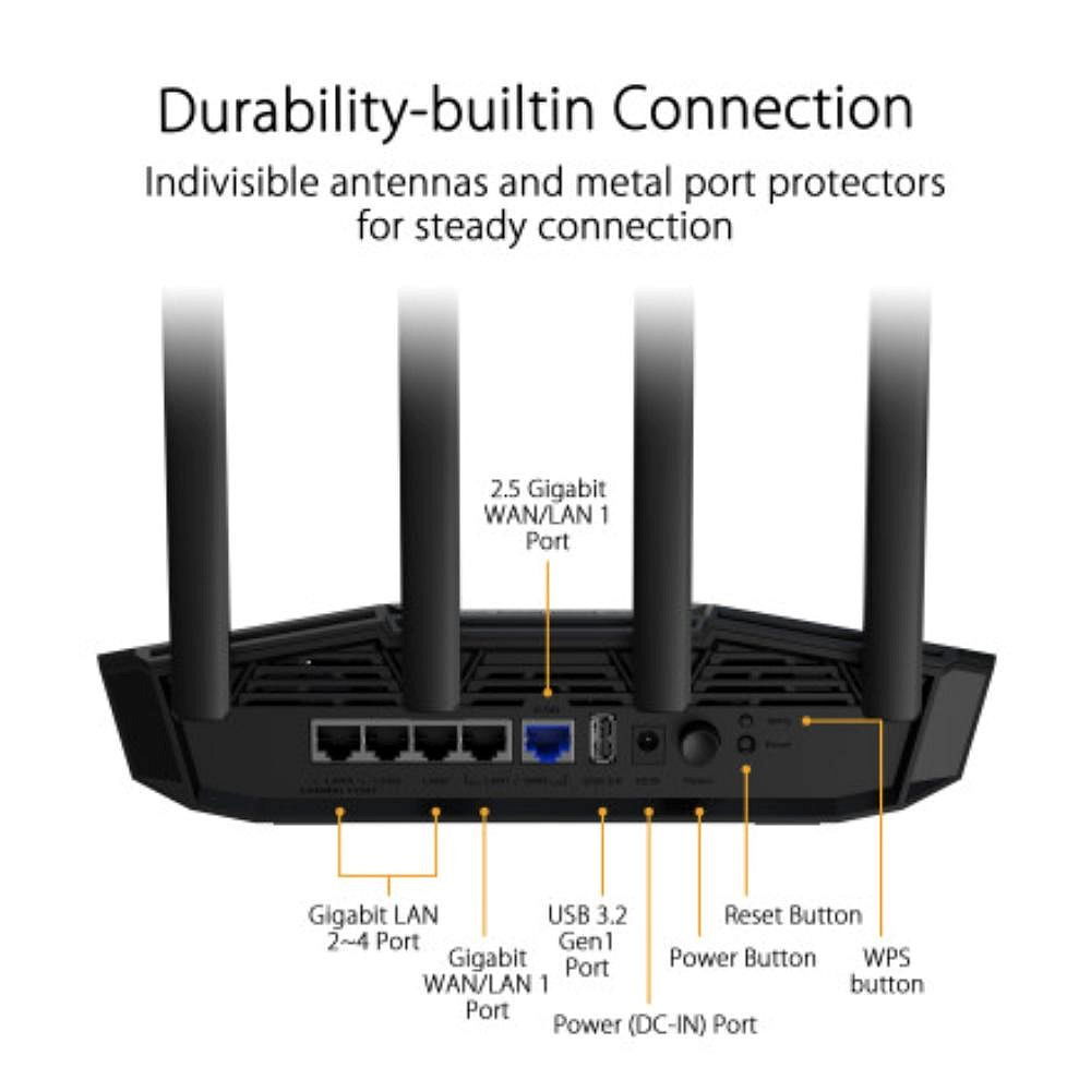 | Zabezpečení | AiProtection, VPN, podpora WPS, WPA/WPA2/WPA3-Personal, WPA/WPA2-Enterprise, WPS, Let's Encrypt, DNS-over-TLS, SSH, bezpečnostní skenování, firewall, • Maximální počet klíčových slov pro filtr firewallu: 64, • Maximální počet síťových služeb pro filtr firewallu: 32, • Maximální počet URL adres pro filtr firewallu: 64 |