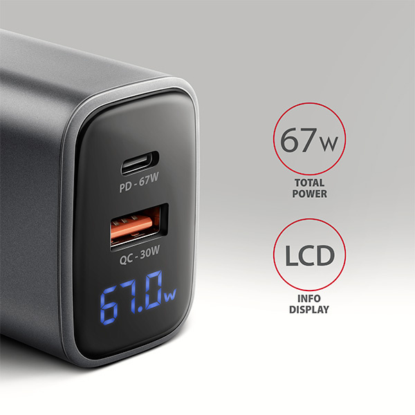 Tělo napájecího adaptéru má příjemný tvar a kompaktní velikost. Ve srovnání s klasickými nabíjecími adaptéry se stejnými parametry je velikost této nabíječky až o polovinu menší. Kombinace malých rozměrů, dosažených pomocí GaN technologie, a širokého rozsahu vstupního napětí, dělá z této nabíječky ideálního pomocníka na cesty. Integrovaný LCD displej přehledně zobrazuje aktuální nabíjecí výkon ve wattech v reálném čase, takže máte snadnou kontrolu nad tím, že připojené zařízení skutečně využívá například rychlé nabíjení.