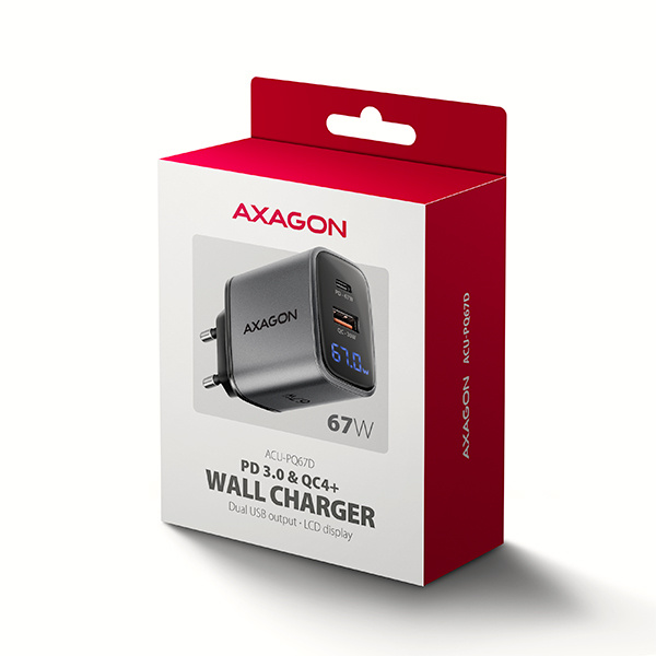 Akčné ponuky na váš e-mailCestovní nabíječka do sítě AXAGON ACU-PQ67D GaN umožňuje rychlé nabíjení až dvou mobilních zařízení současně. Díky celkovému výkonu 67W dokáže nabíječka dobíjet notebooky, tablety, telefony a další mobilní zařízení nejvyšší možnou rychlostí. Adaptér nabízí nejen standardní USB-A konektor, ale také oboustranný USB-C konektor. Přehledný LCD displej zobrazuje aktuální výkon nabíjení.