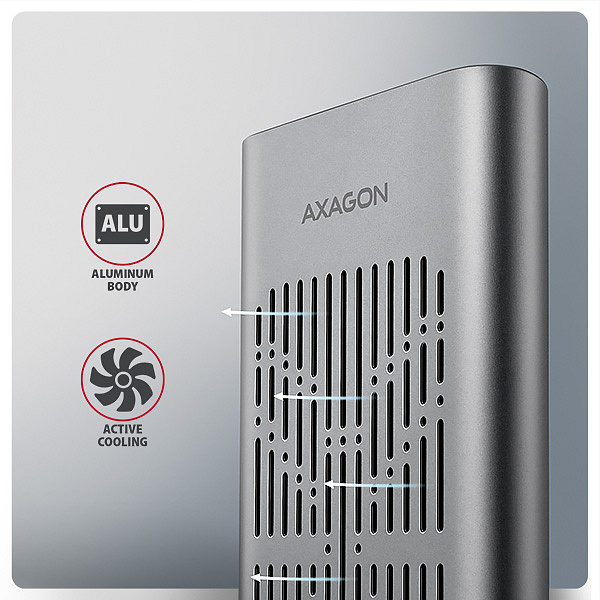 Hliníkové tělo boxu společně s teplovodivými podložkami odvádí teplo z vložených M.2 SSD disků. Chlazení podporuje i aktivní ventilátor, díky kterému nepřetržitě proudí vzduch uvnitř zařízení. Tím se udržuje optimální provozní teplota při dlouhodobé zátěži (například při klonování nebo přenosu velkých objemů dat). Riziko přehřívání a zpomalování disků vlivem tzv. „Thermal Throttling“ je tak minimální. To stabilizuje výkon a prodlouží životnost vašim SSD.
