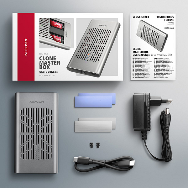 Akčné ponuky na váš e-mailRychlý externí box AXAGON EEM2-20GD CLONE MASTER s rozhraním USB 20Gbps. Box funguje nejen jako externí úložiště pro dva M.2 NVME SSD disky současně, ale také jako dokovací stanice, která umožňuje jednoduše klonovat M.2 disky bez použití počítače. Spolehlivé připojení umožňuje oboustranný USB-C konektor. Součástí balení je kabel USB-C -> USB-C pro připojení boxu k počítači.