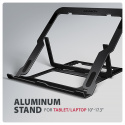 Podstavec je vyroben z hliníkových odlitků garantujících dlouhou životnost a spolehlivost. Díky protiskluzové úpravě se nemusíte obávat nežádoucích pohybů – vaše zařízení zůstane pevně na svém místě, a to bez poškození povrchu notebooku či podložky. Tyto pečlivě navržené vlastnosti zaručují perfektní stabilitu pro váš notebook, tablet nebo dokonce oblíbenou knihu, což vám poskytne klid a pohodlí při každodenním používání.