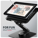 360° mechanismus umožňuje otočení celého ramene s notebookem okolo své osy. Tato funkce zajišťuje maximální flexibilitu – snadno změníte orientaci notebooku, aniž byste museli stojan přemisťovat. To oceníte zejména při práci v omezených prostorech, nebo při sdílení obrazovky notebooku při obchodních jednáních, poradách nebo prezentacích.