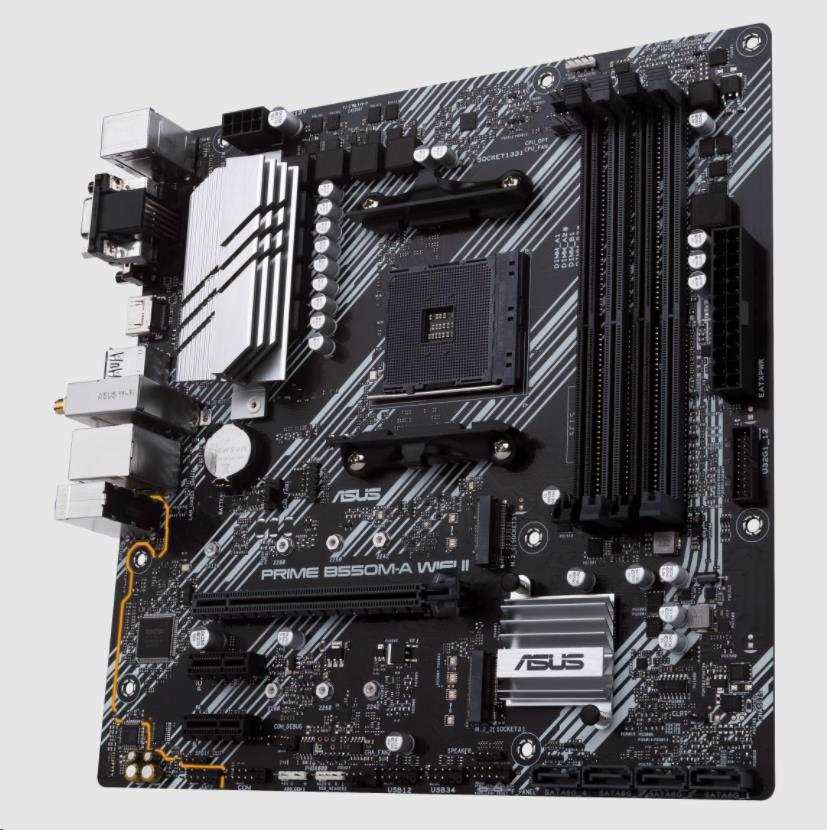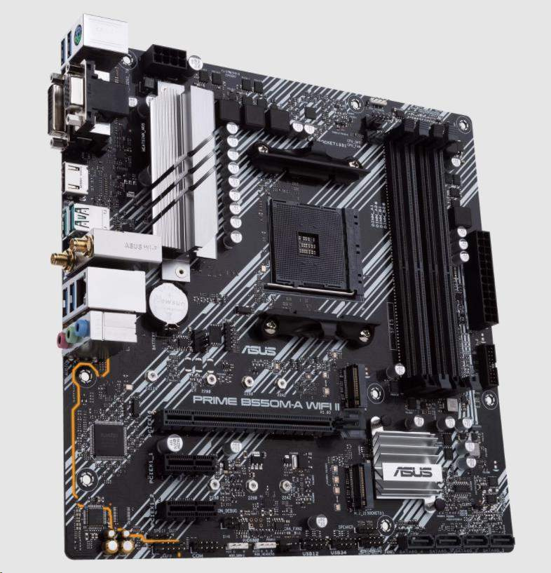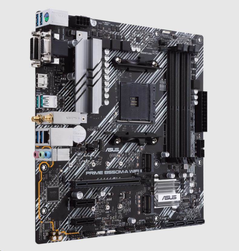 Akčné ponuky na váš e-mailAMD B550 (Ryzen AM4) micro ATX motherboard with dual M.2, PCIe 4.0, Wi-Fi 6, 1 Gb Ethernet, HDMI, DVI-D, D-Sub, SATA 6 Gbps, USB 3.2 Gen 2 Type-A, and Aura Sync RGB lighting support