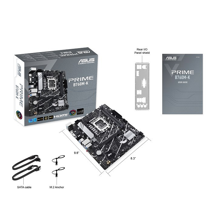 Akčné ponuky na váš e-mailASUS Prime B760M-K, an Intel® B760 LGA 1700 mATX motherboard with PCIe 4.0, two PCIe 4.0 M.2 slots, DDR5, Realtek 2.5Gb Ethernet, VGA, HDMI™, SATA 6 Gbps, front USB 3.2 Gen 1, Aura Sync