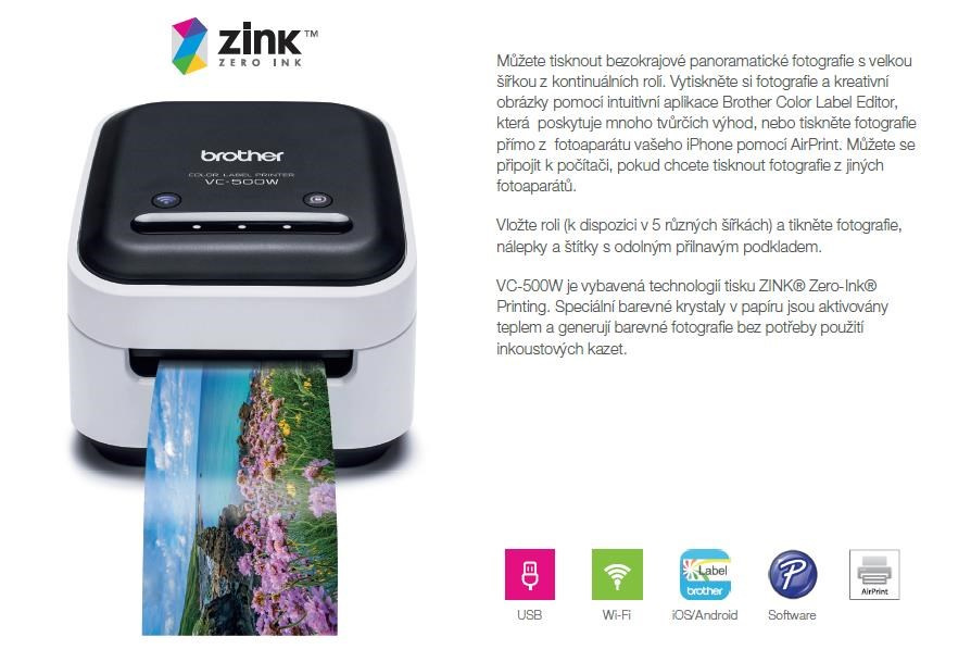 Popis BAZAR - BROTHER tiskárna štítků FOTO - VC500W - WIFI, USB, COLOR bez potřeby inkoustu - Integrovaný odstřih - Poškozený