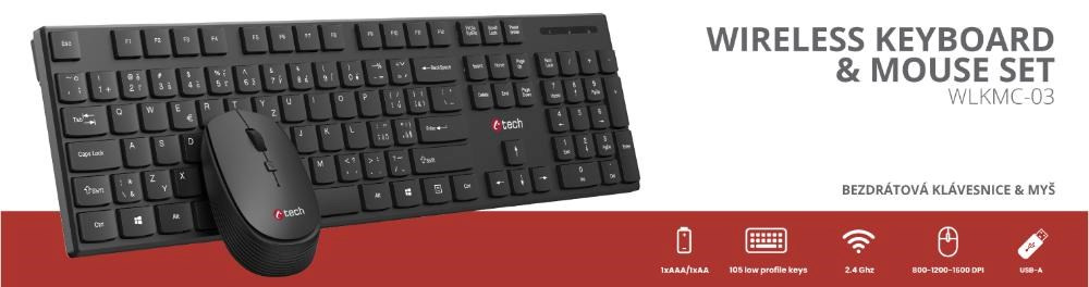 Akčné ponuky na váš e-mailBezdrôtový set klávesnice a myši C-TECH WLKMC-03 prináša pohodlie a slobodu pohybu bez rušivých káblov. Vďaka spoľahlivej 2,4GHz bezdrôtovej technológii získate stabilné a rýchle pripojenie s dosahom až 10 metrov, čo zabezpečuje plynulú prácu bez výpadkov. Stačí pripojiť kompaktný USB-A prijímač do portu vášho počítača a môžete ihneď začať pracovať – nie je potrebná žiadna zložitá inštalácia vďaka technológii Plug & Play.