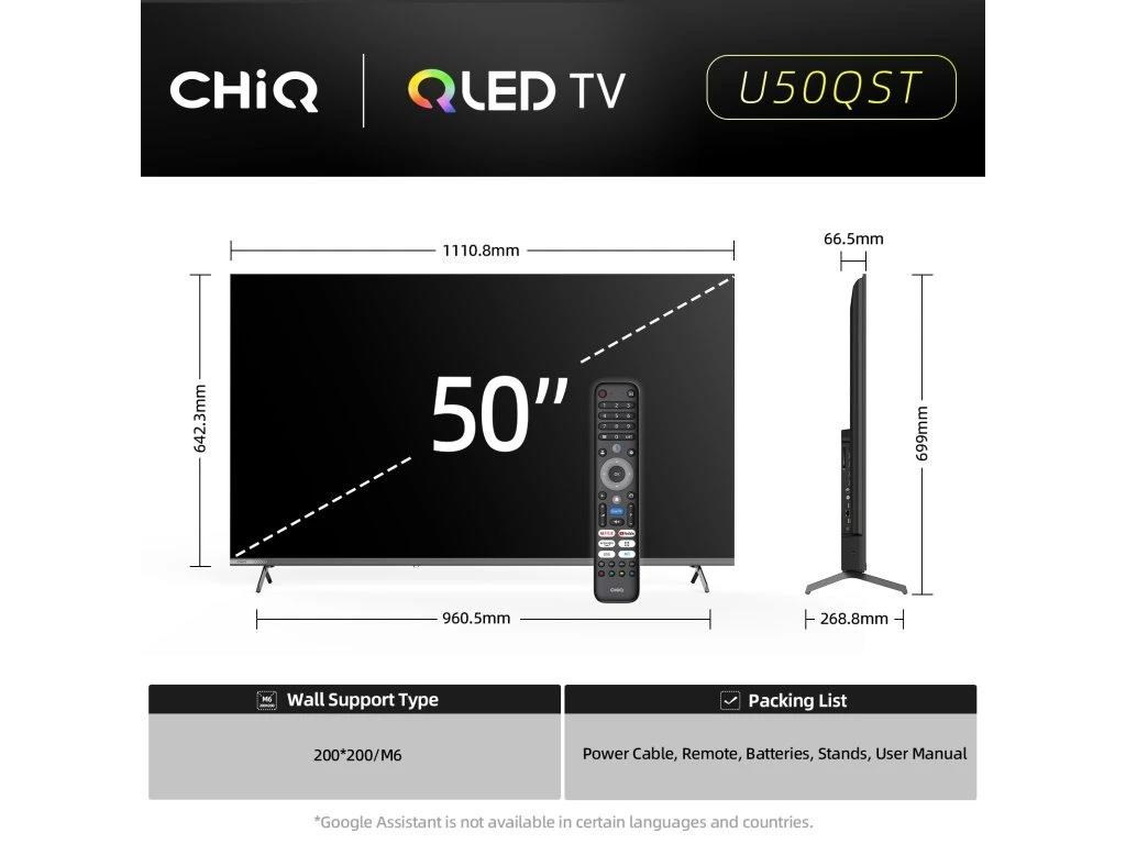 CHiQ 50“ U50QST, ultra tenká kovová bezrámečková QLED Smart Google TV 5.0 s niekoľkými hernými funkciami, HDR10, HLG, obraz s Ultra HD rozlíšením 3840 x 2160 pixelov, priestorový zvuk Dolby Audio a dbx-tv.