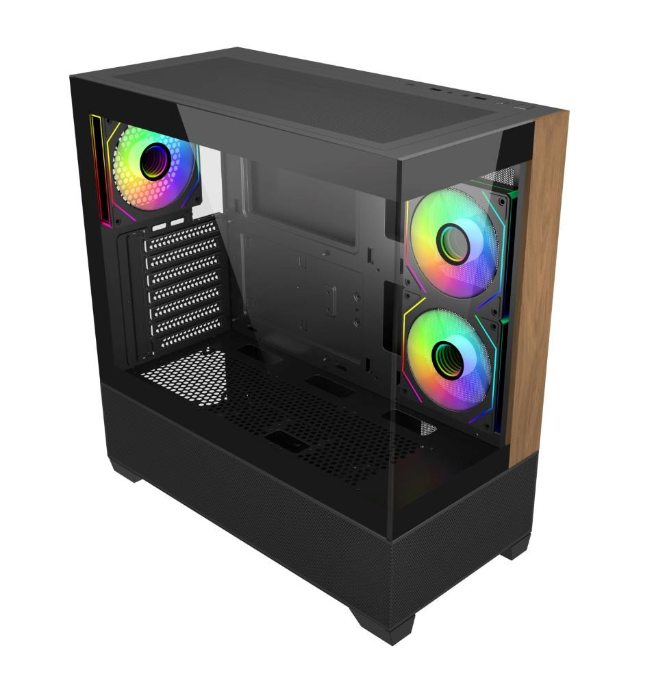Akčné ponuky na váš e-mailModel Elite 690 má čistý a moderný dizajn a je vybavený dvomi panelmi z tvrdeného skla na prednej a bočnej strane, ktoré prezentujú prémiové komponenty a RGB osvetlenie. Predný panel kombinuje prírodný akcent s textúrou dreva so spodným nasávaním zo sieťoviny, čo prináša estetickú teplo a efektívne prúdenie vzduchu. Vďaka rozsiahlému vetraniu na hornej a dolnej strane podporuje skriňa univerzálne konfigurácie ventilátorov a chladičov, ktoré umožňujú výkonné vertikálne chladenie. Či už staviame vysoko výkonnú prezentačnú zostavu alebo štýlovú stolnú zostavu, Elite 690 poskytuje dokonalú rovnováhu medzi funkčnosťou a formou.