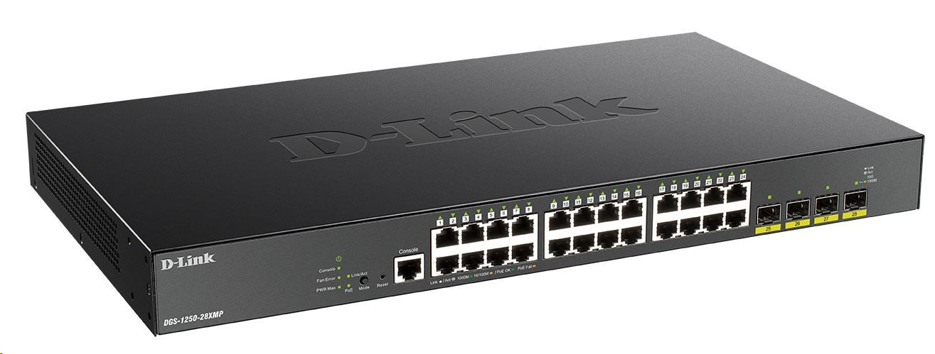 Popis BAZAR - D-Link DGS-1250-28XMP 28-port Gigabit Smart PoE Switch, 24x GbE PoE+, 4x SFP+, PoE 370W - Poškozený obal (Komple