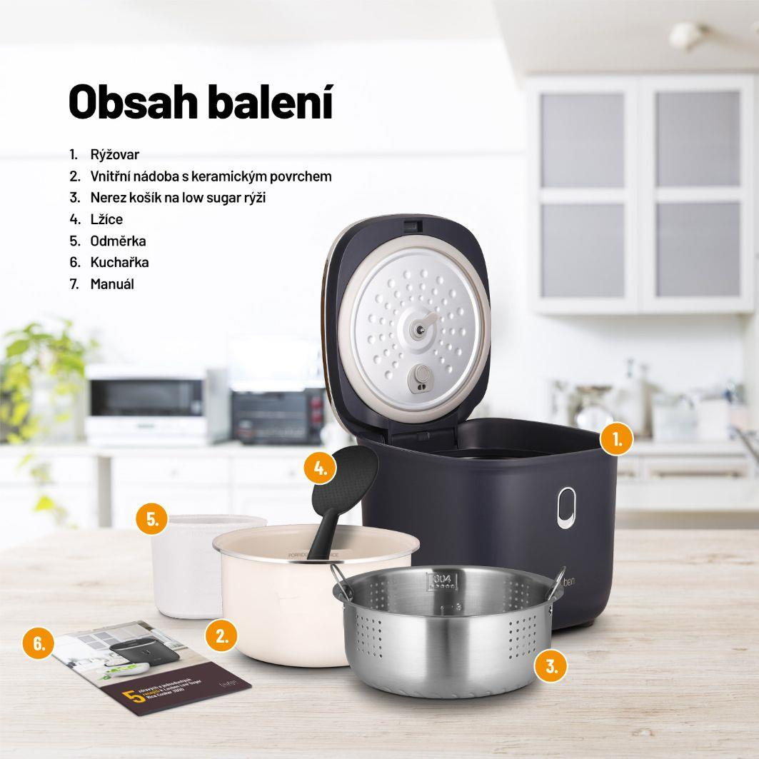 Zbaví vás až 40 % sacharidov v ryžiAk chcete jesť zdravšie, viacúčelový ryžovar Lauben Low Sugar Rice Cooker 3000AT by vám nemal chýbať. Jeho funkcia low sugar zbaví ryžu až 40 % sacharidov. Prístroj si poradí so všetkými druhmi ryže, ale aj s ďalšími surovinami, napríklad strukovinami. Vybrať si môžete zo 6 režimov, ktoré však možno ručne upraviť. Prémiový neprilnavý keramický povrch jeho 3l nádoby pripraví jedlo pre celú rodinu bez nutnosti použitia tuku a obáv z pripálenia. Teší sa na funkciu Keep Warm, ktorá udrží pokrmy teplé bez nebezpečenstva rozvarenia, odložený start či ochranu pred pretečením a technológiu Cool Touch, vďaka ktorej sa o ryžovar nepopálite. Dotykové tlačidlá uľahčujú nastavenie ryžovaru. Jednoduchá údržba je samozrejmosťou, stačí dať vnútornú časť do umývačky riadu. Na inšpiráciu sme pribalili aj kuchárku.