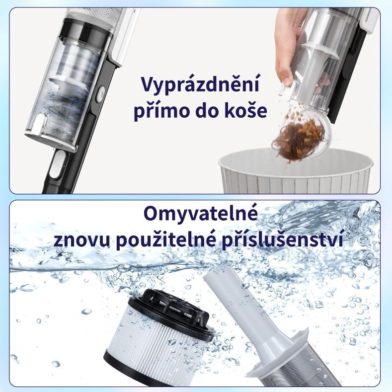 LVAC200 možno vyprázdniť priamo do koša stlačením tlačidla. Jeho filtre a kefy sú tiež umývateľné. Hygiena zaručená.