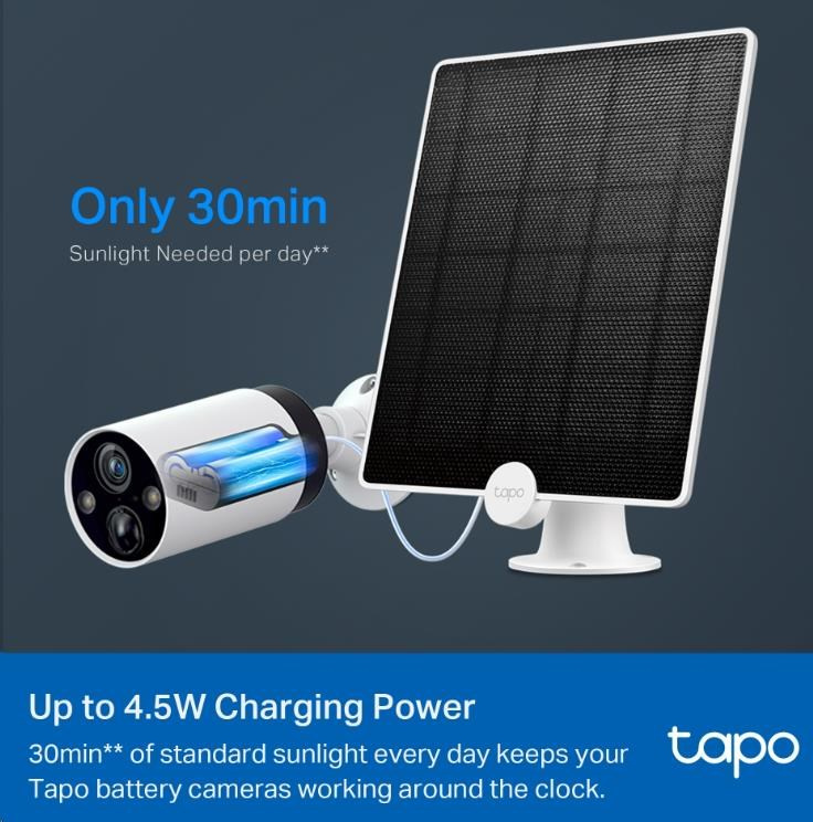 | Obsah balenia | Solárny panel Tapo A200 Nastaviteľný montážny držiak Nabíjací kábel 4 m/13 ft Montážne hmoždinky Montážne skrutky Montážny šablón Vodotesná tesniaca podložka Rýchly návod na použitie |
