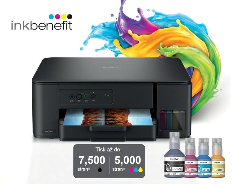 Kompaktná tlačiareň 3 v 1 DCP-T230 tlačí dlhšie s inkoustovými fľaštičkami so super vysokou výťažnosťou, čo znižuje náklady na farebnú stránku. Rýchlo naplňte nádržky počas niekoľkých sekúnd, bez toho, aby ste museli držať fľaštičky. Doplnenie inkoustov je jednoduché a bez rizika jeho rozliatia. Inovatívny systém zámku fľaštičiek zabezpečuje, že vždy doplníte správnu farbu.