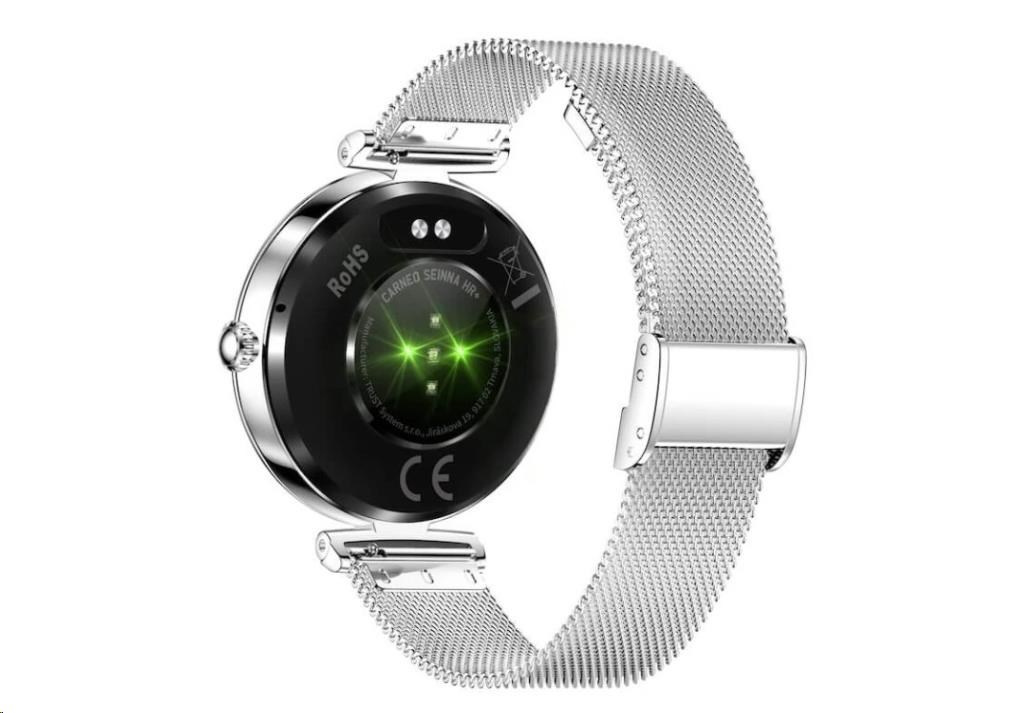 Moderné, luxusné fitness hodinky Carneo Seinna HR+ v elegantnom striebornom prevedení disponujú SUPER AMOLED displejom, ktorý je možné aktivovať jednoduchým otočením ruky. Merajú srdcový tep, krvný tlak, okysličenie krvi, prejdenú vzdialenosť, spálené kalórie a kvalitu spánku. Súčasťou je batéria s výdržou cca 4–5 dní. Podľa certifikácie IP68 sú odolné voči vode a prachu. Hodinky s podporou technológie Bluetooth 5.2 sú kompatibilné s operačným systémom iOS a Android. Kovový, pletený remienok je príjemný na dotyk a zaručuje komfort po celý deň. Remienok je možné vymeniť za svetlosivý silikónový remienok, ktorý je súčasťou balenia.