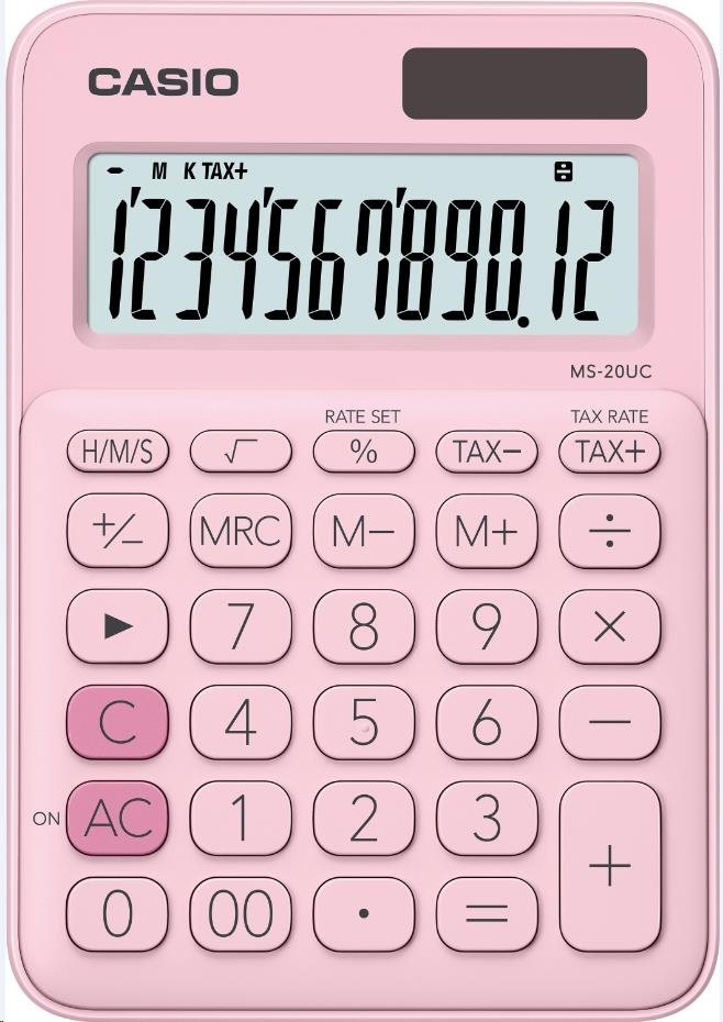 Stolný kalkulátor v módnych trendových farbách Veľký 12-miestny displej Výpočet DPH Výpočet percent Výpočet odmocniny Tlačidlo +/- Tlačidlo pre opravu zadania Tlačidlo dvojité nuly Výpočty s časom Napájanie: duálne solárne/batériové Rozmery: 23x105x149,5 mm Hmotnosť: 110g