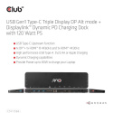 Akčné ponuky na váš e-mailClub 3D CSV-1566 USB Gen1 Type-C Triple Display DP™ Alt mode + Displaylink™/ USB mode™ Dynamic PD Charging Dock so 120 W PS je integrované riešenie kombinujúce video, dáta, napájanie, ethernet a zvuk. Táto dokovacia stanica sa dokonale hodí na rozšírenie portu typu C alebo portu USB-A (prostredníctvom prevodníka typu C na USB), aby poskytovala viacero zvukových, video, dátových a napájacích portov, a predstavuje tak ideálne riešenie pre používateľov, ktorí potrebujú viacero portov. Tento dok má 3 video porty (2 HDMI™, jeden z DP™1.2 režimy Alt, jeden z režimu USB, 1 Displayport™ z režimu USB) pre zážitok z videa, 4 USB Gen1 Type-A a 1 USB Gen1 Type-C pre prenos dát, RJ45 pre super vysokorýchlostný Ethernet, sloty na karty SD/TF pre pripojenie pamäťových kariet. Okrem toho má inteligentný nabíjací port, ktorý prináša rýchle nabíjanie pripojených mobilných zariadení (telefóny Apple, Samsung, podložky atď.). Na napájanie funkcií tohto doku a nabíjanie hostiteľa s maximálnym výkonom 80 W (20 V/4 A) sa dodáva 120 W napájací adaptér. Tento dok má spodnú konštrukciu, ktorú možno umiestniť pod hostiteľa. Môže pracovať na DP™1.2 Podporované hostiteľské zariadenia USB typu C a -A v režime Alt.