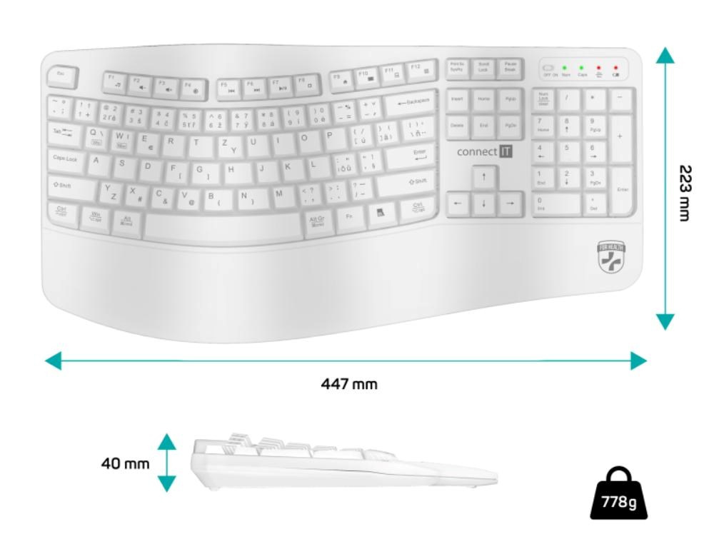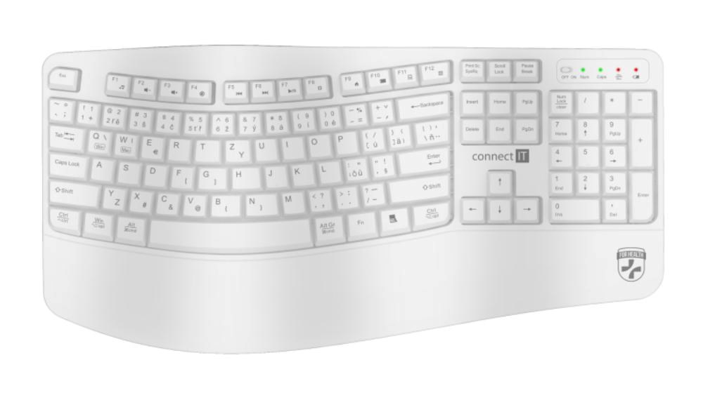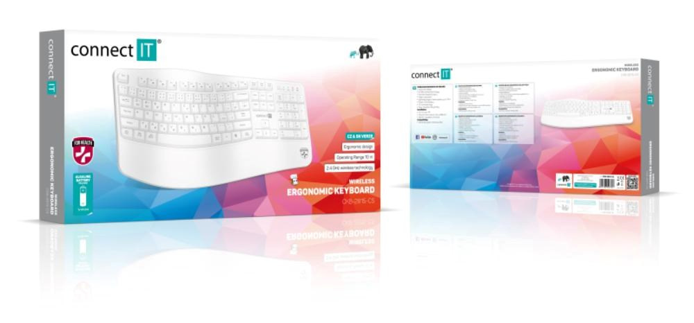 Klávesnice kromě klasických funkcí disponuje 12 multimediálními a funkčními klávesami, které se obzvláště hodí do kancelářského prostředí. Příjemný ergonomický náklon klávesnice pomáhá proti únavě zápěstí během dlouhých pracovních relacích. Samozřejmostí je jeden nano přijímač, který má dosah až 10 metrů. V balení je dodáváná originál CONNECT IT alkalická baterie (1x AA).