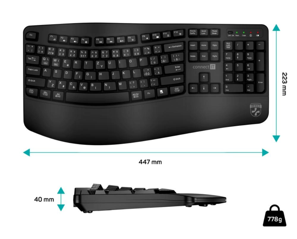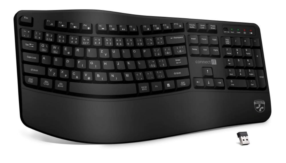 Klávesnice kromě klasických funkcí disponuje 12 multimediálními a funkčními klávesami, které se obzvláště hodí do kancelářského prostředí. Příjemný ergonomický náklon klávesnice pomáhá proti únavě zápěstí během dlouhých pracovních relacích. Samozřejmostí je jeden nano přijímač, který má dosah až 10 metrů. V balení je dodáváná originál CONNECT IT alkalická baterie (1x AA).