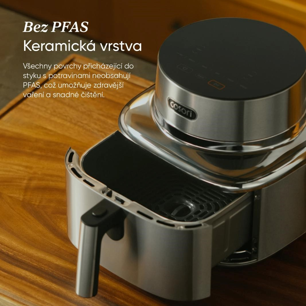 COSORI Iconic bol navrhnutý tak, aby bol prirodzenou súčasťou moderného interiéru, nie len obyčajným spotrebičom. Nerezová oceľ a tvrdené sklo vytvárajú čistý, pokojný vzhľad, ktorý krásne zapadá do minimalistických kuchýň. Je to predmet, ktorý poteší oko zakaždým, keď okolo neho prejdete.