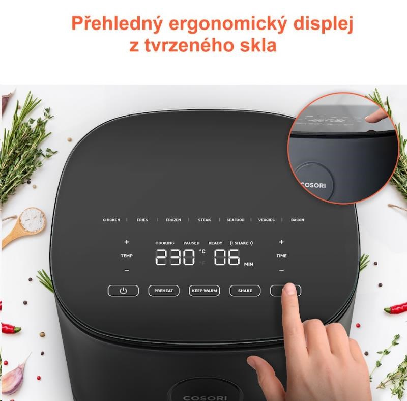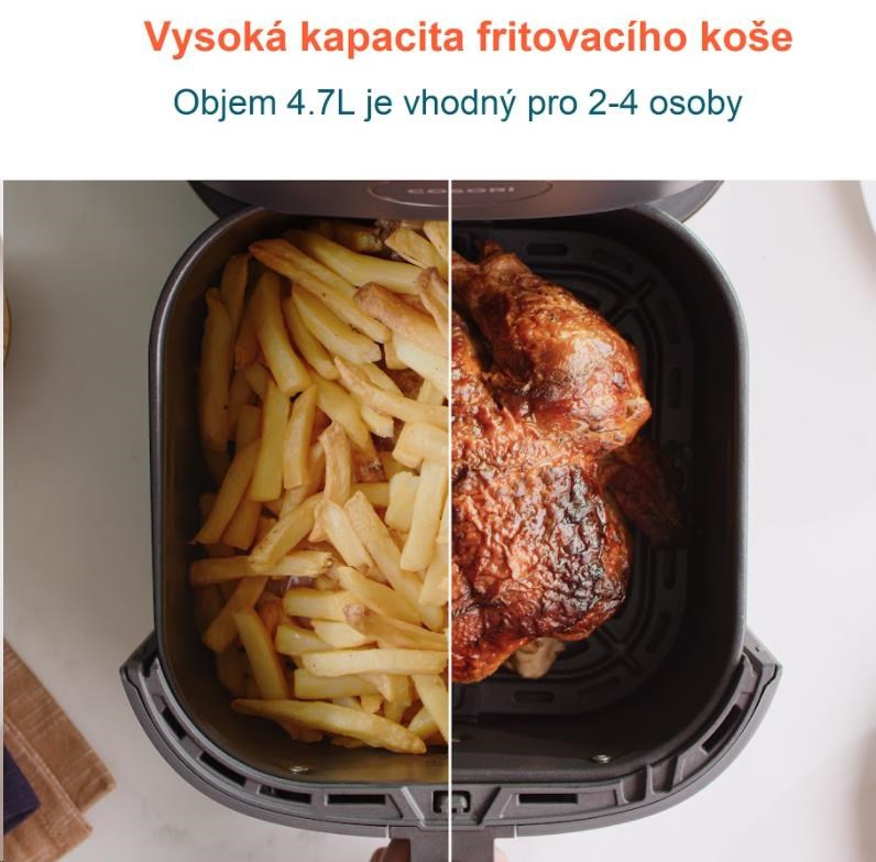 Akčné ponuky na váš e-mailTeplovzdušnou fritézou COSORI CAF-L501-KEUE si môžete užiť vaše obľúbené vyprážané jedlá bez výčitiek, pretože na rozdiel od bežného vyprážania alebo fritovania je v tejto fritéze možné pripravovať jedlá za použitia veľmi malého množstva oleja alebo vôbec žiadneho. Kombinácia cirkulujúceho horúceho vzduchu, dokonalej teploty varenia a chytrých programov zaistí, že hranolky budú vždy krásne chrumkavé a kuracie stehná šťavnaté. Či už je vaše jedlo čerstvé alebo mrazené, stlačením tlačidla môžete horúcim vzduchom smažiť kuracie krídla, kuracie prsia, sladké zemiaky, steaky, čerstvé hranolky a mnoho ďalšieho. Až budete mať hotovo, čistenie bude veľmi jednoduché vďaka nepriľnavému košu, ktorý je možné umývať v umývačke. Vďaka nádobe s objemom 4,7 l navyše dokážete rýchlo navariť aj väčšie porcie jedla.