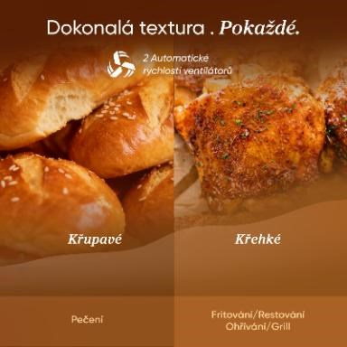 Vo vnútri zabezpečujú dva výkonné jednosmerné motory rýchlejšie zahrievanie a efektívnejší prietok vzduchu. To znamená kratšie časy varenia pri zachovaní nižšej spotreby energie. Potraviny sú hotové rýchlejšie, ale bez kompromisov v chuti alebo štruktúre. Skutočné výhodné riešenie.