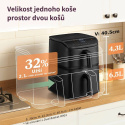 Jedinečný dizajn dvoch košov nad sebou umožňuje pripravovať viacero jedál naraz, oddeliť hlavné jedlo od prílohy a ušetriť miesto na kuchynskej linke. Vďaka pokročilým technológiám Sync and Match môžete pri príprave veľkých porcií ľahko nastaviť rovnaký program pre oba koše alebo koordinovať dokončenie hlavného jedla a prílohy v rovnakom čase. Vďaka technológii Dual Blaze s tromi špirálami, dvomi DC ventilátormi a príkonom 2630 W umožňuje teplovzdušná fritéza maximálne rovnomerné varenie, vďaka čomu nie je potrebné často otáčať alebo pretrepávať pripravené suroviny a zakaždým zabezpečí dokonale zlatisté a chrumkavé jedlo. Vďaka maximálnej teplote 230 °C môžete vo fritéze dokonca grilovať! Vďaka siedmim všestranným funkciám vrátane smaženia, pečenia, grilovania, sušenia alebo kysnutia ide o skutočne multifunkčné zariadenie, ktoré obohatí vašu kuchyňu o nekonečné možnosti varenia.