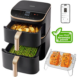 Zdravé varenie teraz nadobúda úplne nový význam. Vďaka keramickému povrchu košov a až o 95 % nižšej spotrebe oleja si môžete vychutnať vyprážané jedlo oveľa zdravšie a predovšetkým chutnejšie. Integrácia inteligentnej aplikácie vám umožňuje ovládať teplovzdušnú fritézu na diaľku, vďaka čomu máte prístup k tisícom receptov a priebežnému stavu prípravy, čo vám uľahčí prípravu zdravých a chutných jedál. Vďaka siedmim všestranným funkciám vrátane fritovania, pečenia, grilovania, sušenia alebo kysnutia ide o skutočne multifunkčné zariadenie, ktoré obohatí vašu kuchyňu o nekonečné možnosti varenia. Vďaka pripojeniu Wi-Fi môžete fritézu dokonca ovládať a monitorovať na diaľku a pomocou aplikácie máte prístup k receptom a výživovým tipom.