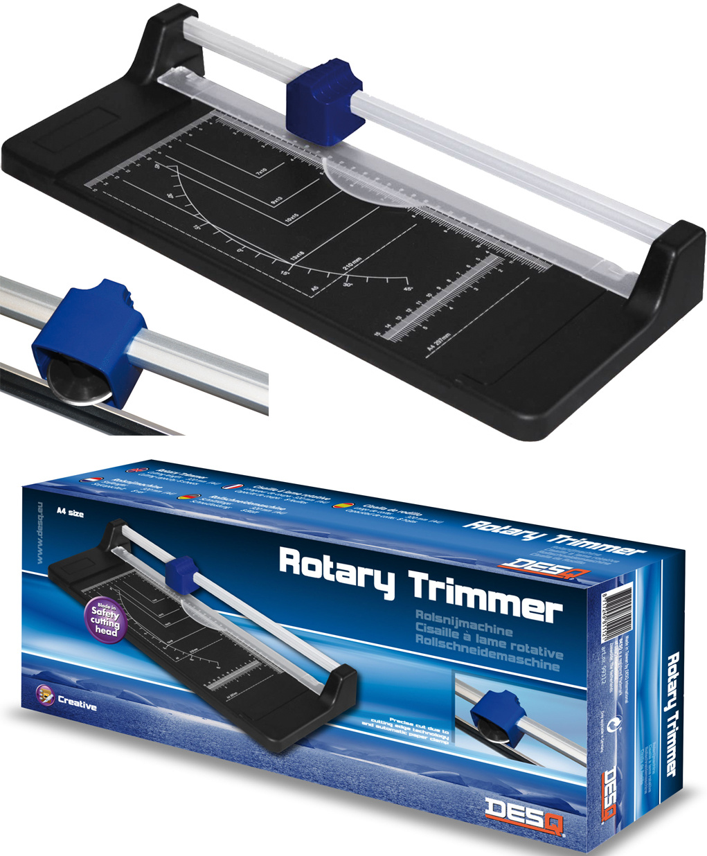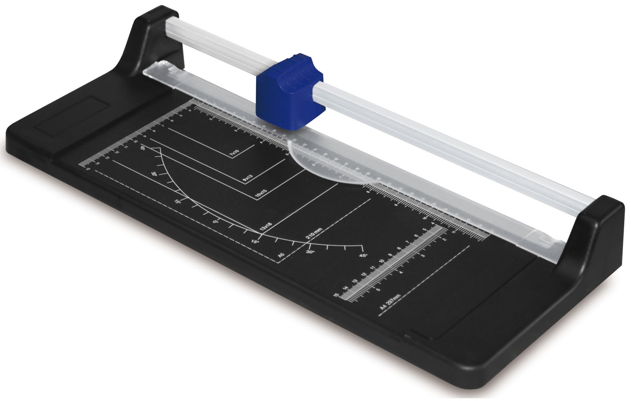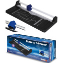 Odolná rotačná rezačka na presné rezanie papiera a lepenky. ? Rotačná a spodná čepeľ pevne pripevnené k pracovnej doske ? Rez až 8 listov papiera naraz ? Zobrazené štandardné formáty A pre jednoduché zarovnanie ? Uhlová stupnica pre presné rezanie pod uhlom Dokonalý nástroj do kancelárie, školy aj na domáce kreativné projekty.