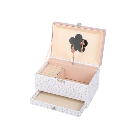 Detská šperkovnica zdobená drobnými kvetmi, s roztomilým zajíčkom na veku, očarí každú malú parádivku. Šperkovnica pre deti, s členitým vnútorným priestorom a praktickou zásuvkou v spodnej časti, ponúka dostatok miesta na uloženie prsteňov, dievčenských šperkov, drobných pokladov. Uvnútri šperkovnice sa ukrýva nielen zrkadlo, ale aj nežná baletka, ktorá vašej dcérke rada zatancuje.