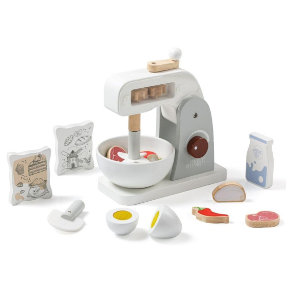 Drevený detský mixér v modernej farebnej kombinácii, v sete s dreveným príslušenstvom, je edukatívna hračka, ktorá umožní deťom vyskúšať si prácu s kuchynským robotom bezpečným detským spôsobom. Otáčanie páčky v hornej časti mixéra uvedie mixér do chodu a tým dodáva hračke reálny nádych. Detský mixér s miskou, drevenými ingredienciami a potravinami, krájecim vajíčkom a výmennými nadstavcami nesmie chýbať v žiadnej detskej kuchynke.
