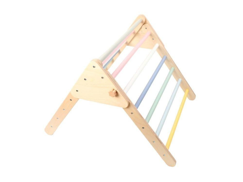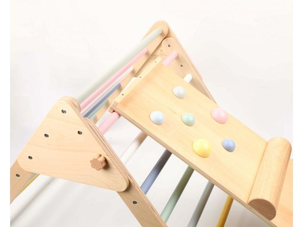 S pastelovým setom Piklerové trojuholníku s montessori obojstranným doskou (skokanka, lezecká stena, stezka bosou nohou, balančná doska) ľahko vytvoríte detské ihrisko priamo u vás doma. Piklerové trojuholníkový set v kombinácii prírodného dreva a pastelových farieb motivuje deti k preskúmaniu, objavovaniu svojich možností, odvahe a k pohybu. Deti pri šplhaní, preliezaní, lezení a kĺzani si precvičia celé telo a ešte si užijú veľa zábavy. Preliezačka je vybavená systémom proti prevráteniu tyčí, bezpečnostným skrutkou a samozrejmosťou sú obrusovaný povrch a hrany.