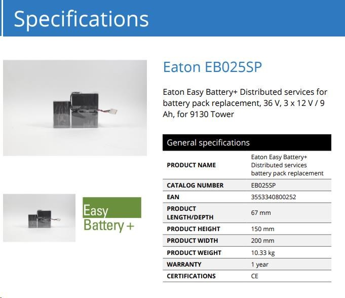 Eaton Easy Battery+ Distributed services for battery pack replacement, 36 V, 3 x 12 V / 9 Ah, for 9130 Tower