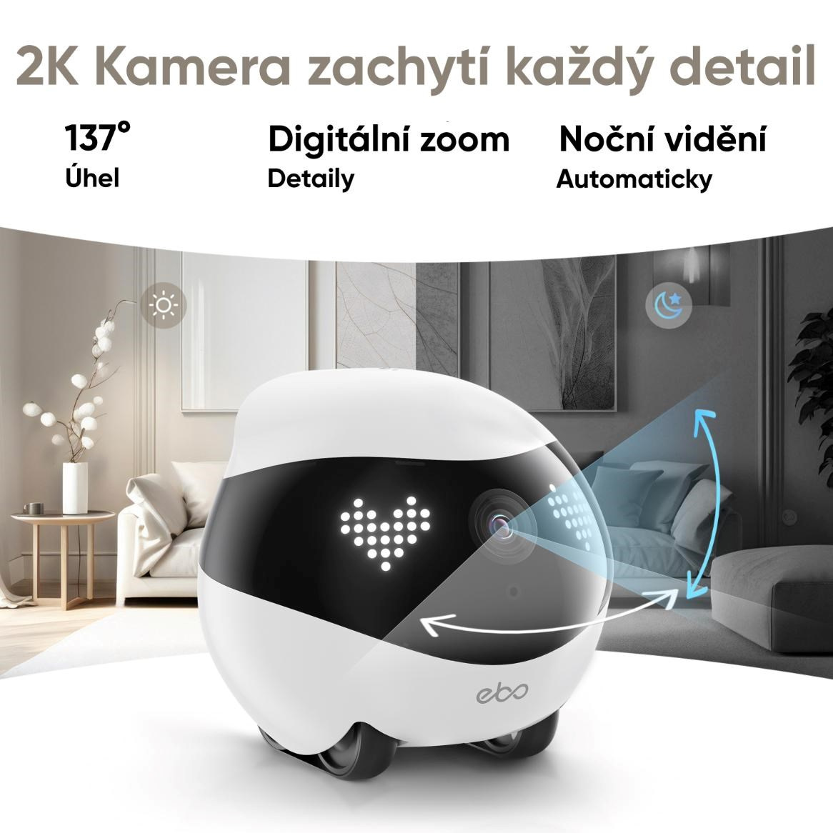 Vestavěná 2K kamera (2304 × 1296) prináša ostrý obraz a vysoký kontrast, ideálny na denný dohľad nad rodinou alebo domácnosťou. S širokouhlým objektívom zachytí viac priestoru a zabezpečí, že vám nič neunikne ani v väčších miestnostiach. Obraz z kamery je plynulý, realistický a vhodný aj na nočné sledovanie vďaka kvalitnému senzoru. Všetko môžete sledovať naživo alebo ukladať na neskoršie prehrávanie priamo v mobilnej aplikácii.