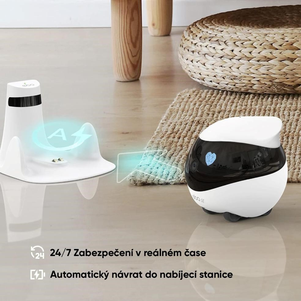 Kvalitná 1080p kamera so širokým uhlom záberu 118° zachytí každý detail, zatiaľ čo vysoko kapacitná batéria 2450 mAh zabezpečuje dlhú výdrž a automatické nabíjanie pomocou docking stanice. Vďaka detekcii pohybu a neobvyklých zvukov vás EBO SE okamžite upozorní na akúkoľvek aktivitu v domácnosti. Jeho mobilita a plánované trasy hliadok umožňujú sledovať viac miestností – omnoho efektívnejšie než bežná IP kamera. Elegantný dizajn a stabilné pripojenie zaisťujú bezproblémový chod aj na väčšiu vzdialenosť.