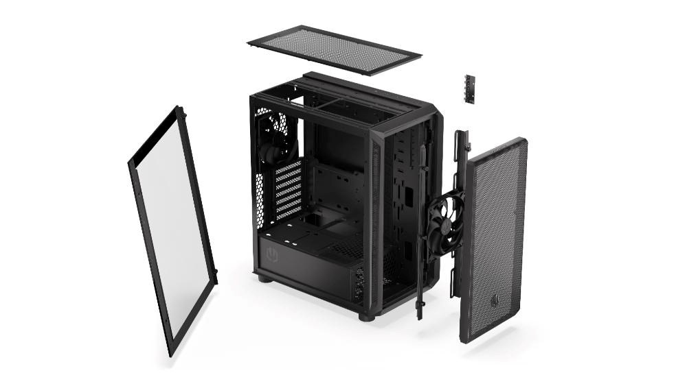 Tvrdené skloPodpora vodného chladeniaPodpora ventilátorovMaximálne veľkosti komponentovPrachové filtreVeľkosť a Hmotnosť