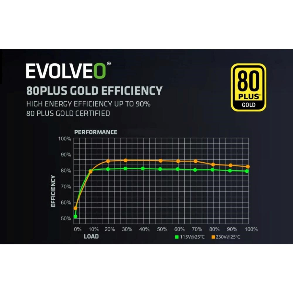PC zdroj EVOLVEO G750-WH je hrdým držitelem certifikace 80 PLUS Gold, která slibuje až 92% účinnost (při běžném 50% zatížení). Minimální ztráty energie a nízké zahřívání jdou přitom ruku v ruce s tichým chodem 140mm HDB ventilátoru – ten má mezi hřídelí a ložisky speciální olejovou vrstvu a jeho tření je nepatrné, takže hlučnost zůstává na minimu. S tímto zdrojem vás zkrátka hučení ventilátoru neruší – slyšet je jen svištění kol vaší formule nebo řinčení zbraní vaší armády.