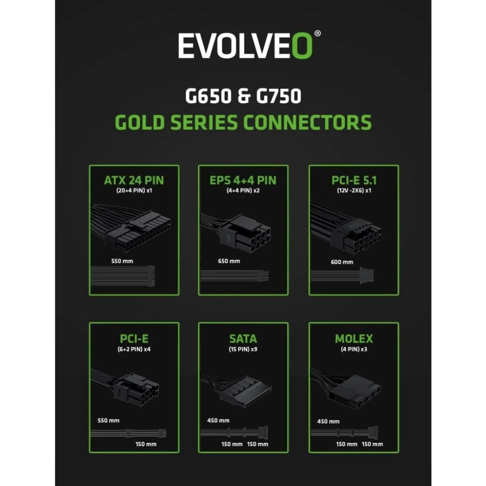 Zabudnite na zamotané kábly, ktoré bránia prúdeniu vzduchu a ešte kazia štýl vašej počítačovej skrine. Zdroj EVOLVEO G850-BK je plne modulárny, takže k nemu pripojíte len tie káble, ktoré naozaj potrebujete. Súčasťou balenia sú všetky dôležité šnúry – jeden kábel ATX 24 PIN, dva EPS 4+4 PIN, dva PCI-E 6+2 PIN, jeden PCI-E 5.1 12V-2×6, tri SATA a jeden MOLEX. Vďaka tomu máte miesto na všetko od CPU a GPU cez disky až po vymazlené LED pásy či iné extra prvky.