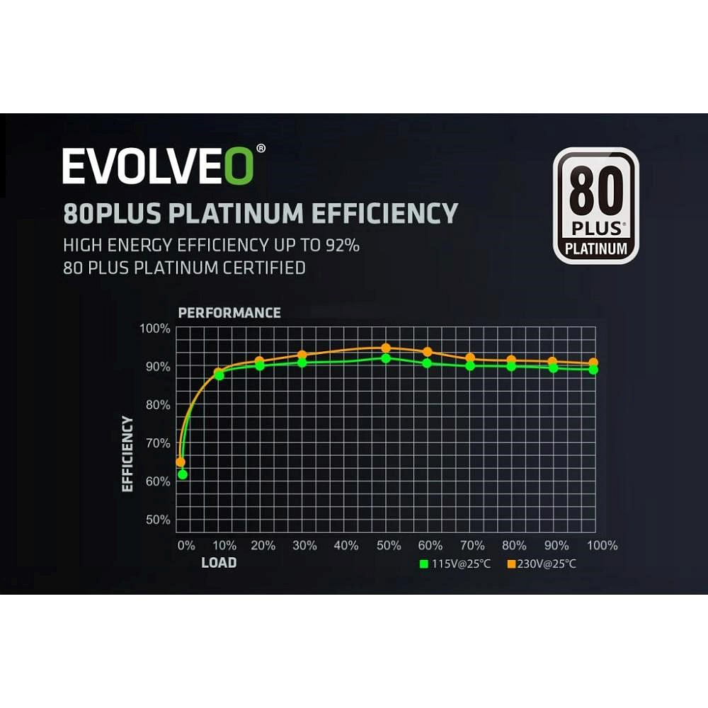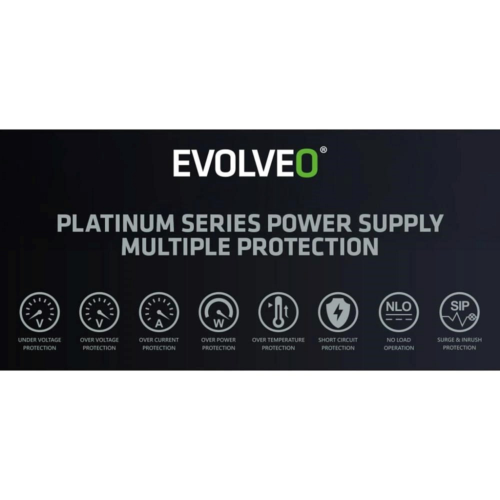 PC zdroj EVOLVEO P1000-BK je hrdým držitelem certifikace 80 PLUS Platinum, která slibuje až 94% účinnost (při běžném 50% zatížení). Minimální ztráty energie a nízké zahřívání jdou přitom ruku v ruce s tichým chodem 140mm HDB ventilátoru – ten má mezi hřídelí a ložisky speciální olejovou vrstvu a jeho tření je nepatrné, takže hlučnost zůstává na minimu. S tímto zdrojem vás zkrátka hučení ventilátoru neruší – slyšet je jen svištění kol vaší formule nebo řinčení zbraní vaší armády.