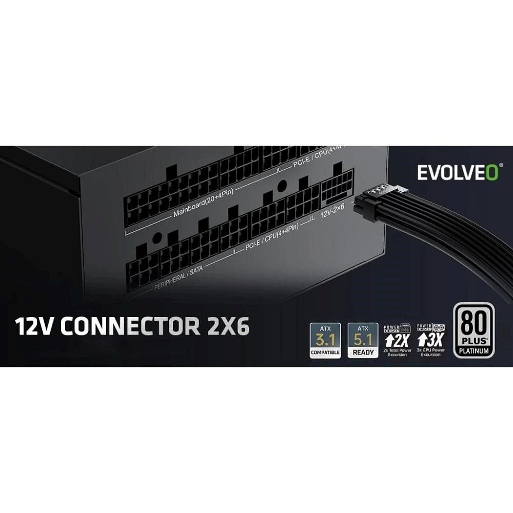 Rozjeďte na svém počítači aktuální herní hit nebo spusťte render náročného videa a pociťte ten masivní příval energie na vlastní kůži. Umožní vám to EVOLVEO P1200-BK – herní PC zdroj, s nímž má váš počítač dostatek síly na všechny výzvy dnešního digitálního světa. Tento plně modulární 1200W zdroj třídy 80 PLUS Platinum je vyvedený v moderním formátu ATX 3.1 a podporuje i standard PCIe 5.1, takže s ním běží jako po másle i náročné grafické karty nové generace. Jeho pořízením si zkrátka zajistíte bezpečné, stabilní a efektivní napájení, které vaše herní doupě napumpuje energií, již si zaslouží.