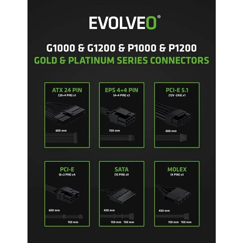 Zapomeňte na zamotané kabely, které brání proudění vzduchu a ještě vaší počítačové skříni kazí styl. Zdroj EVOLVEO P1200-BK je plně modulární, takže k němu připojíte jen ty kabely, které opravdu potřebujete. Součástí balení jsou všechny důležité šňůry – jeden kabel ATX 24 PIN, dva EPS 4+4 PIN, dva PCI-E 6+2 PIN, jeden PCI-E 5.1 12V-2×6, tři SATA a jeden MOLEX. Díky tomu máte místo na vše od CPU a GPU přes disky až po vymazlené LED pásky či jiné extra prvky.