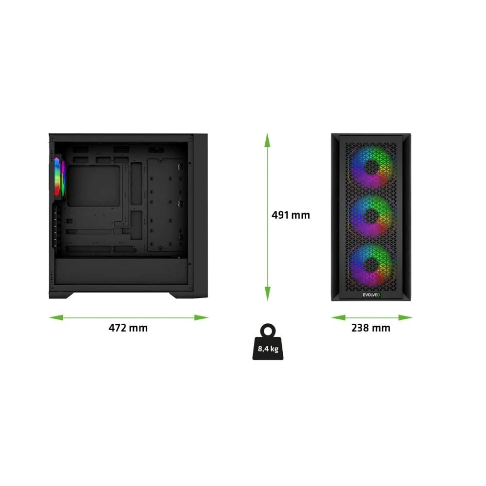 V počítačové skříni EVOLVEO Rhino-BK-4 je dostatek místa na všechno, co má nadupaná herní mašina mít. Vejde se sem až 415mm grafická karta, chladič procesoru o výšce až 180 mm i všechny potřebné disky – ve skříni jsou 4 pozice pro 3,5" HDD a 5 slotů pro 2,5" SSD. Nic vám tak nebrání sestavit si počítač, jehož hardware hraje první ligu. O to, aby vnitřek skříně působil čistě a profesionálně, se navíc stará 32mm Cable Management pro skrytí kabeláže.