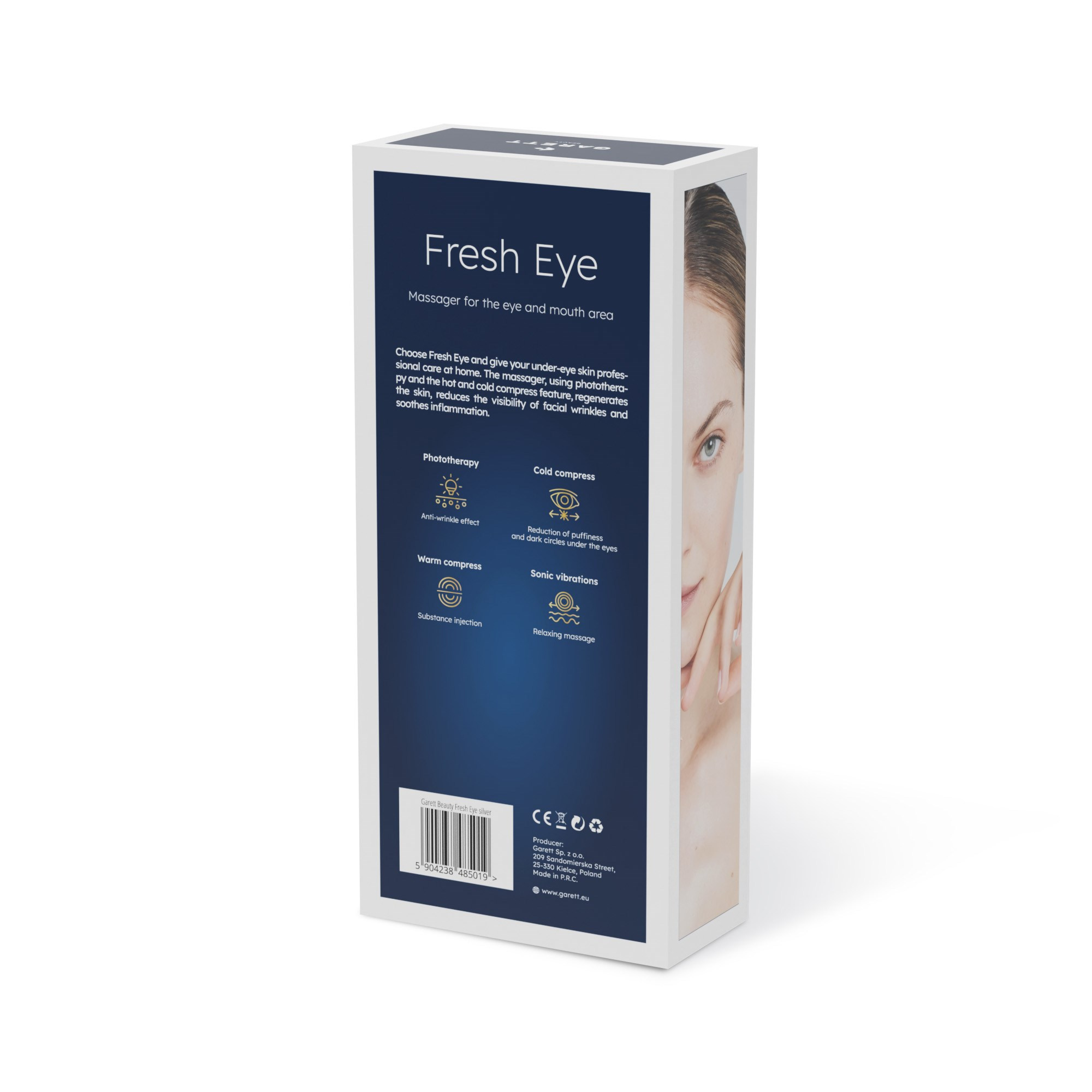 Objavte nový rozmer starostlivosti s Garett Beauty Fresh Eye — masážnym prístrojom na okolie očí a úst. Kombinácia LED fototerapie (červené a modré svetlo), chladivého a teplého obkladu a sonickej masáže poskytuje komplexnú starostlivosť, ktorú vaša pleť potrebuje. Vďaka tomu, že Fresh Eye je ľahký a praktický, môže vás sprevádzať kdekoľvek. Starajte sa o svoju krásu vždy, keď to potrebujete.