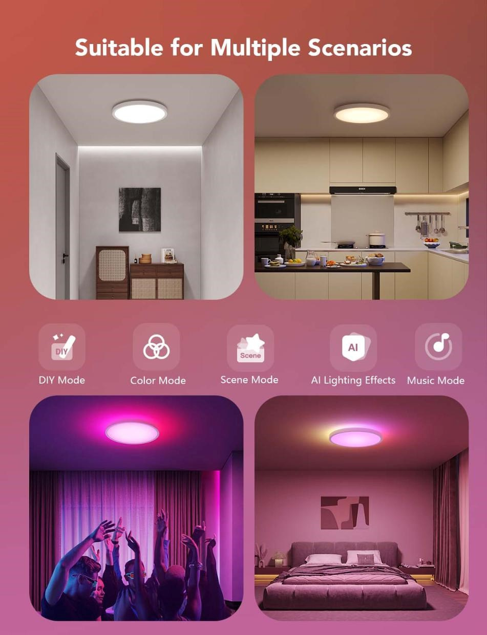 Objavte viac ako 70 inteligentných scén pre dokonalé osvetlenie vášho priestoru! Duálne stropné svietidlo Govee ponúka v aplikácii výkonný režim DIY, ktorý vám umožní vytvoriť si osvetlenie podľa vlastných predstáv. Ľahko si vytvoríte atmosféru, ktorá sa hodí na akúkoľvek príležitosť a v akomkoľvek štýle. Navyše vďaka funkcii Dreamview synchronizujte viacero svetiel Govee na rovnakú farbu, aby ste dosiahli skvelý efekt. Oživte svoj domov so zariadením Govee!